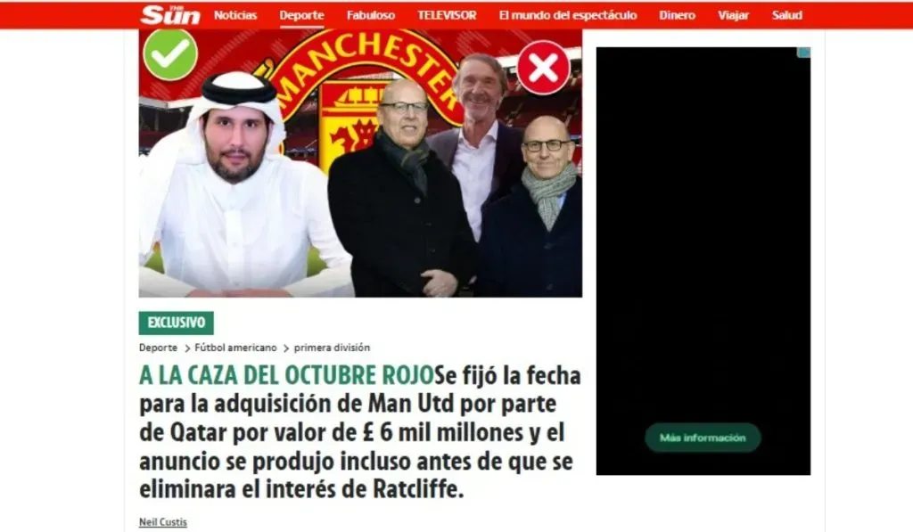 El multimillonario británico Sir Jim Ratcliffe, rival de Doha en la disputa, cada vez más lejos. Por último pero no menos importante, The Sun apunta que Qatar no permitirá a los Glazer permanecer si quiera con acciones del club cuando se de el cambio de mandos. Manchester United, a poco más de 40 días de iniciar una nueva era en Old Trafford.