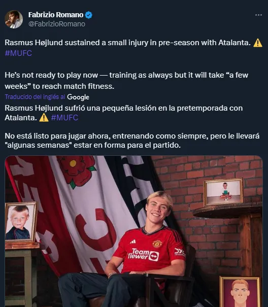 Pero, el entrenador neerlandés no podrá contar en lo inmediato con Højlund. Tal como hicieron trascender varios medios ingleses, el danés llegó con una pequeña lesión producto de la pretemporada con Atalanta. Por tal motivo, no pudo jugar ante Lens y, ciertamente, no podrá hacerlo este domingo ante Athletic Club.