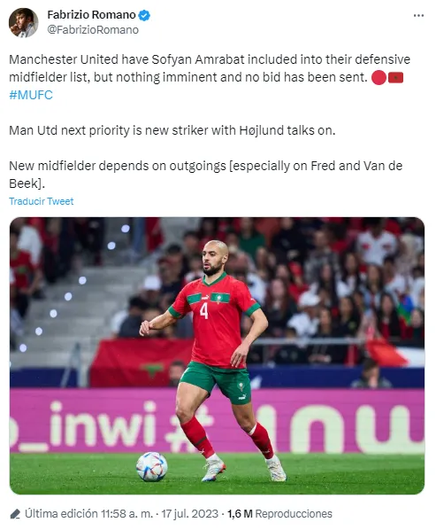Amrabat ha entrado en las consideraciones de Manchester United para este mercado de pases, aunque de momento no han presentado ninguna oferta a Fiorentina. La prioridad del club sigue siendo el fichaje de Rasmus Højlund.