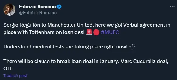 Si bien se mencionó el nombre de Nicolás Tagliafico (Lyon) como opción y hasta llegaron a negociar el préstamo de Marc Cucurella con Chelsea, finalmente, la opción de Reguilón fue la elegida por la directiva de Manchester United. El lateral izquierdo de Tottenham llega en calidad de cedido.