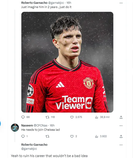 Tal publicación en Twitter generó todo tipo de comentarios, como el de un seguidor que le propuso una transferencia al Chelsea, a lo que Roberto Garnacho respondió: ”Sí, arruinar su carrera, no sería mala idea”. Con esto está claro que, por lo menos por el momento, no está entre los planes del protagonista salir del Manchester United, mucho menos al Chelsea de Mauricio Pochettino.