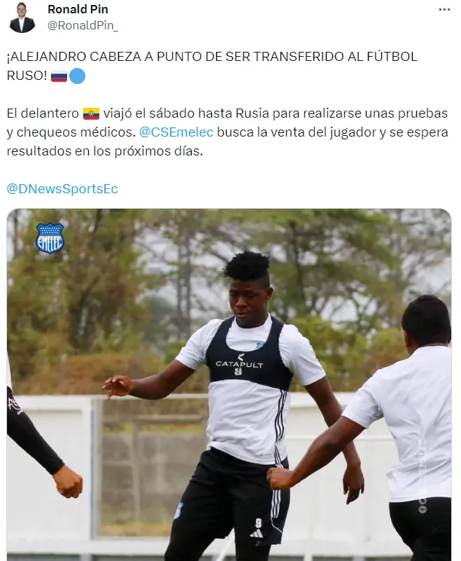 Según la información de Ronald Pin, Emelec estaría muy cerca de acordar la venta de su delantero Alejandro Cabeza, quien ya se recuperó de su lesión y viajó a Rusia para hacerse los chequeos en el que sería su nuevo equipo.