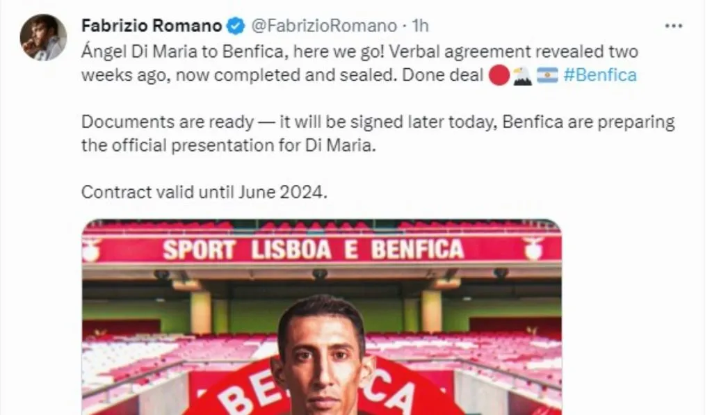 “¡Ángel Di María al Benfica, Here we Go! Acuerdo verbal revelado hace dos semanas, ahora completado y sellado. Trato cerrado. Los documentos están listos, se firmará más tarde hoy, el Benfica está preparando la presentación oficial de Di María. Contrato válido por 12 meses”, la confirmación oficial del gurú del mercado de fichajes sobre el futuro del Fideo.