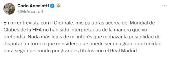 ”En mi entrevista con Il Giornale, mis palabras acerca del Mundial de Clubes de la FIFA no han sido interpretadas de la manera que yo pretendía. Nada más lejos de mi interés que rechazar la posibilidad de disputar un torneo que considero que puede ser una gran oportunidad para seguir peleando por grandes títulos con el Real Madrid”, escribió Carlo Ancelotti.