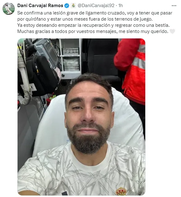 Asimismo, el propio Dani Carvajal también anunció mediante sus cuentas de redes sociales el resultado de los chequeos médicos que se realizó tras el partido con el Submarino Amarillo: ”Se confirma una lesión grave de ligamento cruzado, voy a tener que pasar por quirófano y estar unos meses fuera de los terrenos de juego. Ya estoy deseando empezar la recuperación y regresar como una bestia. Muchas gracias a todos por vuestros mensajes, me siento muy querido”.
