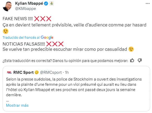 Paralelamente a este asunto, el portal francés RMC Sport publicó este lunes que una mujer realizó una denuncia por acoso, la cual la habría sufrido en el mismo hotel en el que se alojó Mbappé y durante los mismos días en los que el delantero estuvo hospedado con sus amigos. Para evitar cualquier tipo de vinculación e insinuación que lo enlazara con esta denuncia, el propio delantero del Real Madrid salió a aclarar que todo se trataba de una ”Fake News”.