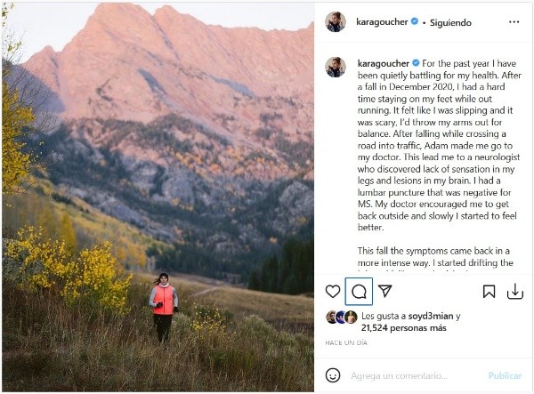 Goucher relató cómo comenzaron los síntomas. Primero hace un año y ahora nuevamente pero mucho peores. “Durante el último año he estado luchando en silencio por mi salud”, comienza el posteo. Una caída fue el primer síntoma de alarma, una sensación de pérdida de equilibrio. Tras consultar a un neurólogo, le detectaron sensibilidad en las piernas y una lesión en el cerebro. Y ya más adelante, luego de descargar diagnósticos más complicados como unaesclerosis múltiple o esclerosis lateral amiotrófica, le pusieron nombre a su padecimiento.