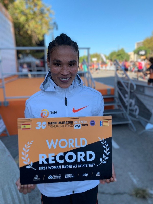Justo en la misma semana en la que la World Athletics decidió no homologar el récord en 21kde su compatriota y compañera de equipo Yalemzerf Yehualaw (el circuito tenía menos metros), Gidey largó en España y se quedó con la mejor marca mundial de la distancia: 1 hora 2 minutos y 52 segundos, siendo la primera atleta en correr por debajo de los 64 minutos.