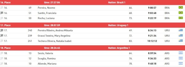 Por equipos, el mejor posicionado fue Brasil entre los hombres, ocupando el octavo lugar. Argentina fue 17° y Uruguay 21. Entre las mujeres, Brasil fue 17°, Argentina 18° y Uruguay 19°.