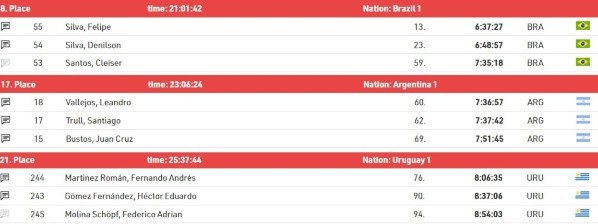 El mejor sudamericano de la clasificación fue Felipe Silva, de Brasil, quien finalizó en el puesto 16 con 6h37m27. El mejor argentino fue Leandro Vallejos (73), el uruguayo más veloz fue Fernando Andrés Martínez Román (108) y por México, José Romero, 139.