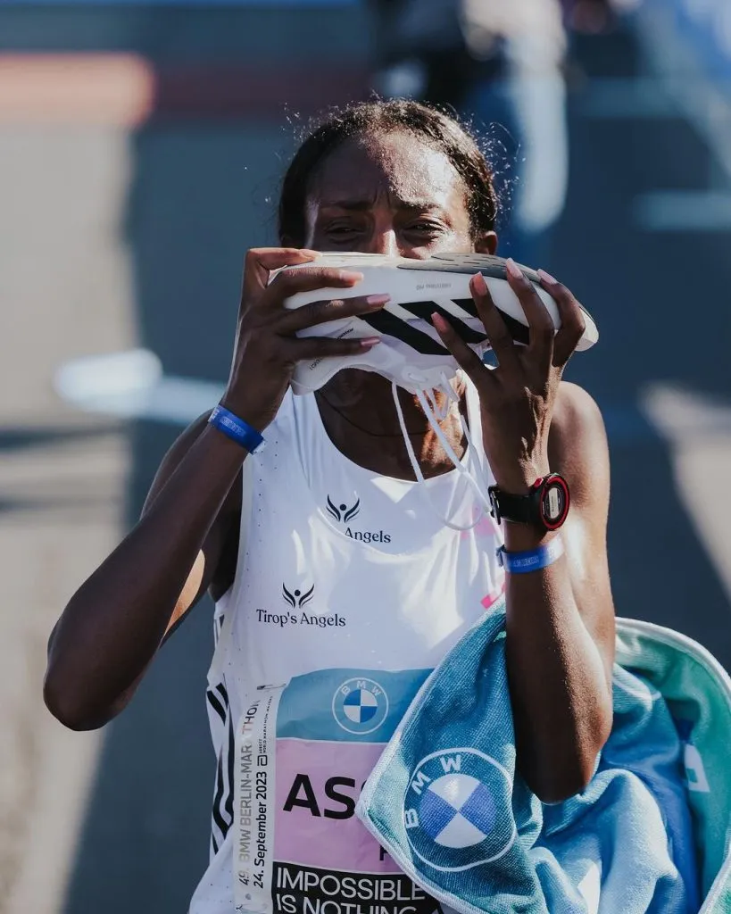 Cruzó la meta, se arrodilló y besó el asfalto. Pero después, se quitó una zapatilla y se la mostró al mundo. Sí, ellas también ganaron el Maratón de Berlín. Y no sólo eso: consiguieron un récord del mundo, que aún debe ser homologado, pero que tiene todo para serlo. Tigist Assefa corrió los 42k alemanes en 2 horas 11 minutos y 53 segundos, rebajando la anterior marca mundial en más de dos minutos. Brigid Kosgei había logrado imponerse con 2h14m04 desde 2019.