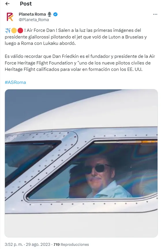 Más allá del traslado de Romelu Lukaku, no se trataba de un vuelo común y corriente. El propuetario de AS Roma, Dan Friedkin decidió pilotar personalmente el avión privado que llevó al belga en la ruta Londres-Bruselas-Roma. Vale recordar que este es presidente de la Air Force Heritage Flight Foundation.
