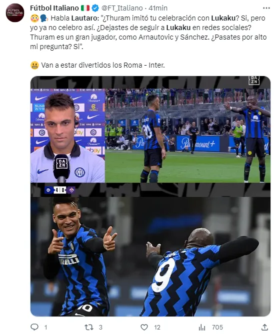 Lautaro Martínez aseguró ante los micrófonos de DAZN que no volvería a hacer esa celebración. El jugador fue repreguntado por su relación con el belga y su respuesta sorprendió. “¿Dejé de seguir a Lukaku en las redes sociales? Thuram es un gran jugador, estoy feliz de jugar con él, lo mismo con Arnautovic y Sánchez. ¿Pasé por alto la pregunta? Sí“.