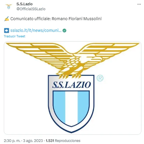“SS Lazio anuncia que ha cedido temporalmente hasta el 30 de junio de 2024 los derechos deportivos del futbolista Romano Floriani Mussolini a Defino Pescara 1936” dice el comunicado oficial.