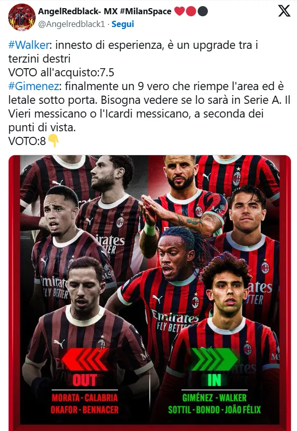 Al respecto, los hinchas del Rossonero demostraron grandes expectativas. En resumen, consideran que el delantero de la Selección de México le podrá dar el plus que el equipo de Sergio Conceiçao necesita para pelear la Serie A, ganar la Copa Italia y ser realmente protagonista en la UEFA Champions League (justamente se medirá en los Play Off al Feyenoord, el ex equipo de Giménez).