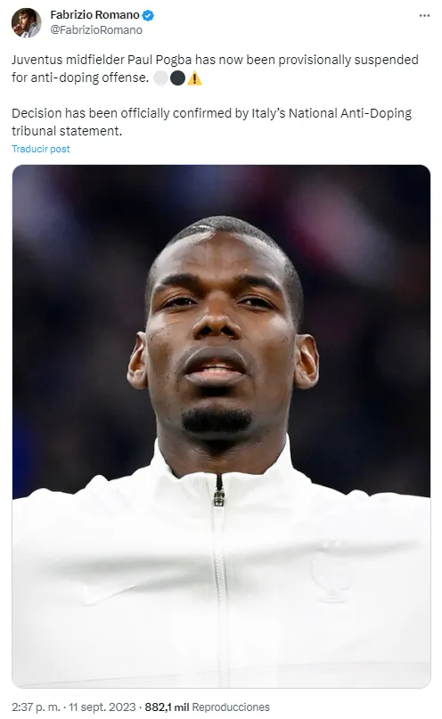 “El Tribunal Nacional Antidopaje anuncia que, aceptando la solicitud propuesta por la Fiscalía Nacional Antidopaje, ha adoptado medidas cautelares para suspender al deportista: Paul Labile Pogba por la infracción de los artículos 2.1 y 2.2; sustancia encontrada: Metabolitos de testosterona de origen no endógeno“.