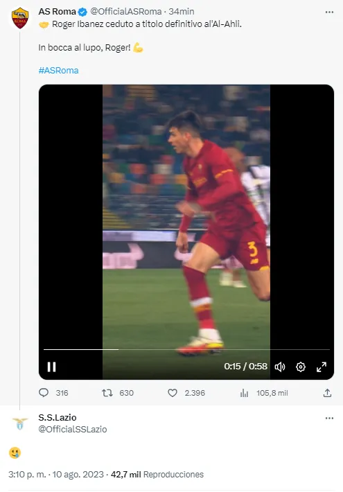 La rivalidad entre Lazio y AS Roma se traslada a las redes sociales y el equipo lazial ha aprovechado una mínima oportunidad para cargar a sus rivales de ciudad. Le Aquile se burlaron del video de despedida del jugador, Roger Ibáñez.