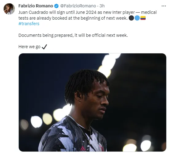“Juan Cuadrado firmará hasta junio de 2024 como nuevo jugador del Inter. Las pruebas médicas ya están agendadas a principios de la próxima semana. Documentos en preparación, será oficial la próxima semana. Here we go“, confirmó el periodista italiano.
