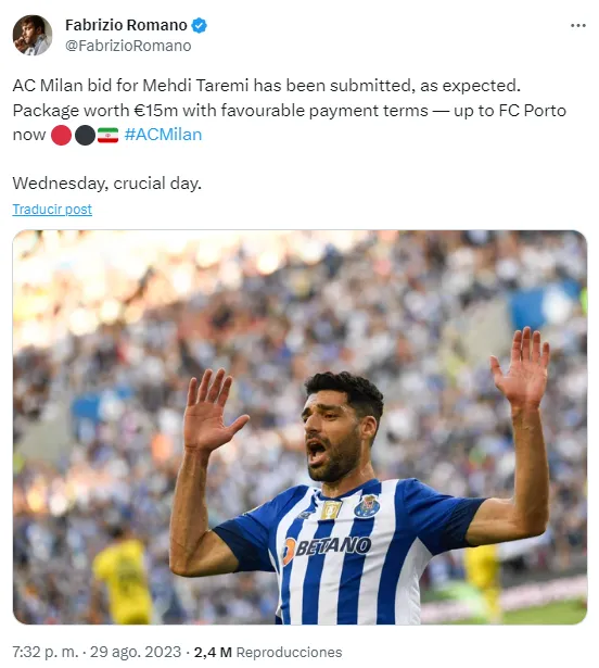 Fuentes cercanas al club han estado reportando los contactos entre AC Milan y FC Porto por la ficha de Mehdi Taremi en las últimas horas. Fabrizio Romano ha asegurado que los italianos presentaron una oferta cercana a los 15 millones de euros por el delantero iraní.