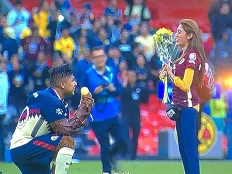 Un aficionado del América se puso el disfraz de la mascota del club y en el medio del partido contra Morelia, le hizo una propuesta a su novia en el medio del mítico recinto.