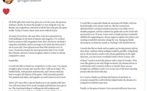 Con 41 años de edad, un centenar de títuloslogrados en toda su carrera y una huella gigantesca en el tenis por la historia ejercida en todo sentido, lo cierto es que el número 1 del mundo durante310semanas puso fin a una trayectoria de ensueño, siendo uno de los máximos exponentes de una era tenística que aún tiene vigente a Rafael Nadal, Novak Djokovic y Andy Murray, los denominados “Big 4“.