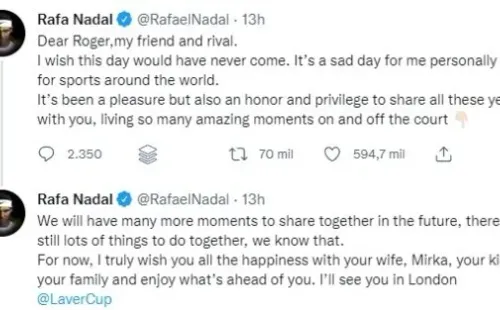 Incluso uno de los mensajes más llamativos lo escribió Rafael Nadal, el hombre que fue rival de siempre en el último tiempo del tenista suizo de 41 años. También a través de sus cuentas sociales indicó: “desearía que este día nunca hubiera llegado. Es un día triste para mí personalmente y para los deportes de todo el mundo”.