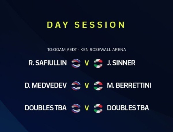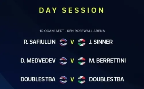 El partidoRomán Safiullin vs. Jannik Sinner se llevará a cabo HOY, miércoles 5 de enero, por la jornada 3 del Grupo B de la ATP Cup. El duelo se desarrollará en el Ken Rosewall Arena de Sídney, Australia.