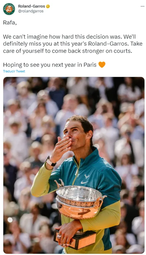 Desde la cuenta oficial de Roland Garros en Twitter, la organización del abierto parisino enió un mensaje de apoyo a su máximo campeón. “Te extrañaremos en Roland Garros este año. Cuídate para volver más fuerte a las pistas. Esperamos verte el próximo año en París“.