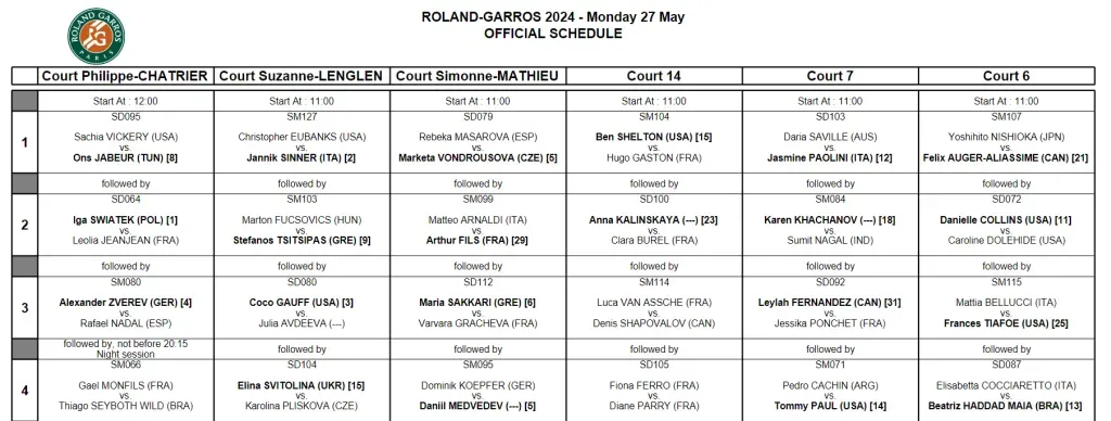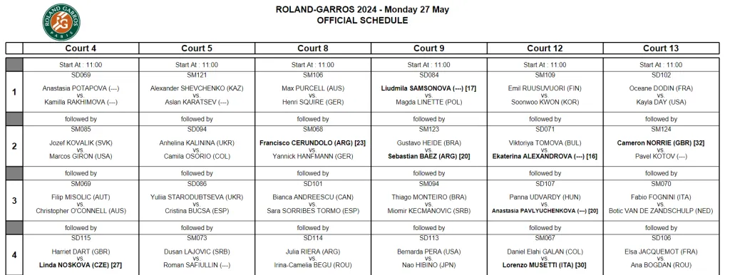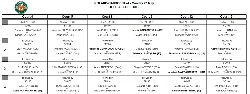 La programación de partidos del lunes 27 de mayo en Roland Garros 2024