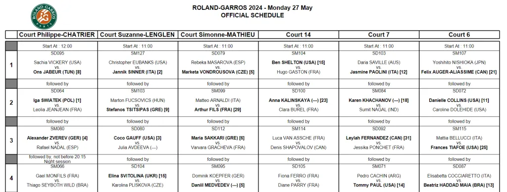 Por su parte, en la cancha Suzanne Lenglen, segunda en importancia, debutará el N°2 del mundo, el italiano Jannik Sinner, quien desde las 11 jugará frente al estadounidense Christopher Eubanks.