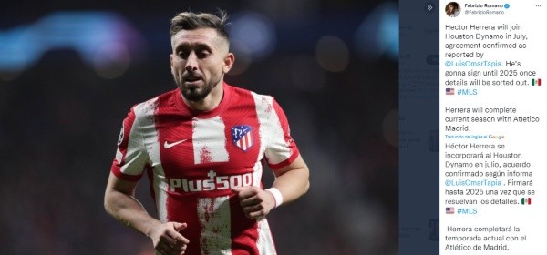 “Héctor Herrera se incorporará al Houston Dynamo en julio, acuerdo confirmado según informa Luis Omar Tapia. Firmará hasta 2025 una vez que se resuelvan los detalles”, fue la información que replicó el periodista experto en fichajes, el italiano, Fabrizio Romano.