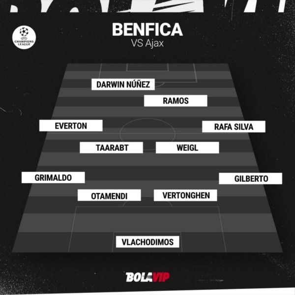 Benfica: Vlachodimos; Gilberto, Vertonghen, Nicolás Otamendi, Álex Grimaldo; Rafa Silva, Julian Weigl, Adel Taarabt, Everton; Darwin Núñez, Gonçalo Ramos.