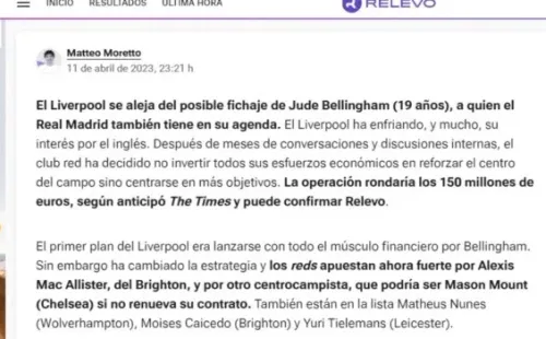 Para entender esta historia hay que situarse en el Signal Iduana Park, donde medios como The Times confirman que Liverpool se encuentra a un paso de retirarse de la operación para fichar a Jude Bellingham. Las alternativas de Jürgen Klopp para reforzar un centro del campo golpeado en los últimos meses, desde Alexis Mac Allister hasta Mason Mount (Chelsea), (Wolverhampton), Moisés Caicedo (Brighton) y Yuri Tielemans (Leicester).