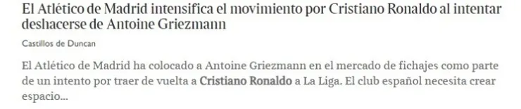 Cristiano Ronaldo está dispuesto a bajarse el sueldo para llegar al norte de Madrid, pero dicho hecho no será suficiente para poder inscribirle en un equipo con overbooking en cada una de sus posiciones y que apenas ha podido lograr algunos de esos 40 millones que tanto ha venido avisando el presidente Enrique Cerezo que se necesitan. The Times se muestra claro, solo Antoine Griezmann puede abrir hueco a CR7 en su víctima preferida.