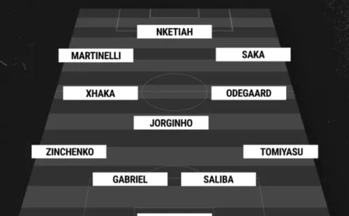 Ramsdale; Tomiyasu, Saliba, Gabriel Magalhaes, Zinchenko; Odegaard, Jorginho, Xhaka; Saka, Nketiah, Martinelli.
