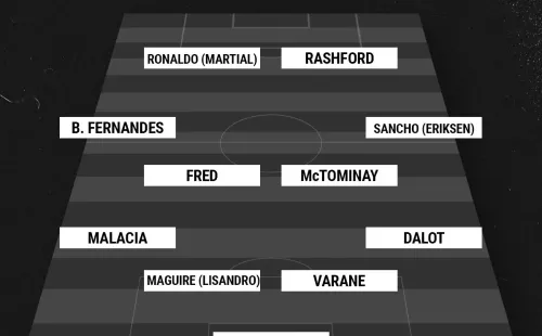 David De Gea; Diogo Dalot, Harry Maguire, Raphael Varane, Tyrell Malacia; Scott McTominay, Fred, Jadon Sancho, Bruno Fernandes; Marcus Rashford y Cristiano Ronado (o Anthony Martial).
