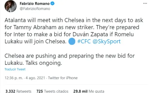 Chelsea, Inter de Milán y Atalanta de Bérgamo, son los clubes que adelantan un importante ‘trueque’ de atacantes. En primer lugar, Lukaku, iría para los Blues de Londres, desde los lombardos; en su reemplazo llegaría Zapata y, ante la ausencia del colombiano, al equipo se sumaría Tammy Abraham.
