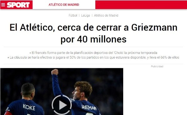 40 millones de euros es la opción de compra pactada entre Barcelona y Atlético de Madrid para negociar una hipotética venta de Griezmann. Si bien quedaría tiempo de sobra para llegar a un acuerdo, desde Sport revelan que el contrato del delantero con los marca que si jugase más del 50% de los encuentros de su primera temporada, el Cholo estaría obligado a comprarlo.