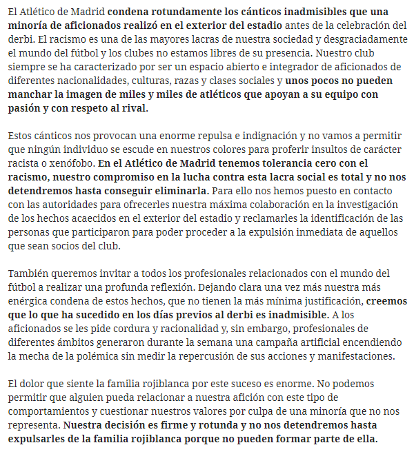“El Atlético de Madrid condena rotundamente los cánticos inadmisibles que una minoría de aficionados realizó en el exterior del estadio antes de la celebración del derbi. El racismo es una de las mayores lacras de nuestra sociedad y desgraciadamente el mundo del fútbol y los clubes no estamos libres de su presencia“, publicaron.