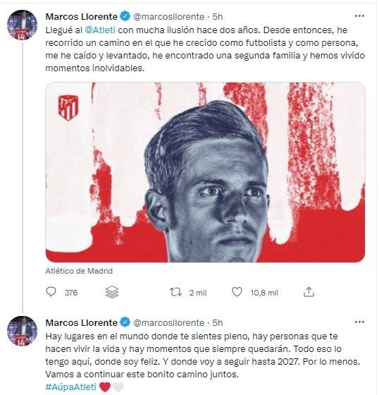 “Llegué al Atleti con mucha ilusión hace dos años. Desde entonces he recorrido un camino en el que he crecido como futbolista y como persona, me he caído y levantado, he encontrado una segunda familia y hemos vivido momentos inolvidables”, dijo Llorente.