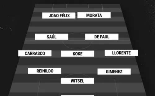 Jan Oblak; Reinildo Mandava, Axel Witsel, José María Giménez; Marcos Llorente, Saúl, Geoffrey Kondogbia, Yannick Carrasco; Rodrigo de Paul, Koke; Álvaro Morata y Joao Félix.
