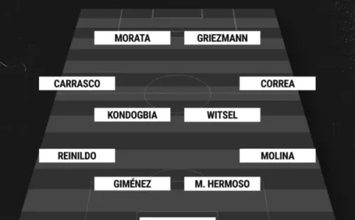 Jan Oblak: Reinildo, José María Giménez, Mario Hermoso, Nahuel Molina: Yannick Carrasco, Axel Witsel, Geoffrey Kondogbia, Ángel Correa;Álvaro Morata y Antoine Griezmann son los elegidos por Diego Pablo Simeone para dar un paso al frente en la Liga de Campeones más difícil para el Cholo en la capital española. Los Colchoneros, obligados a ganar como sea.