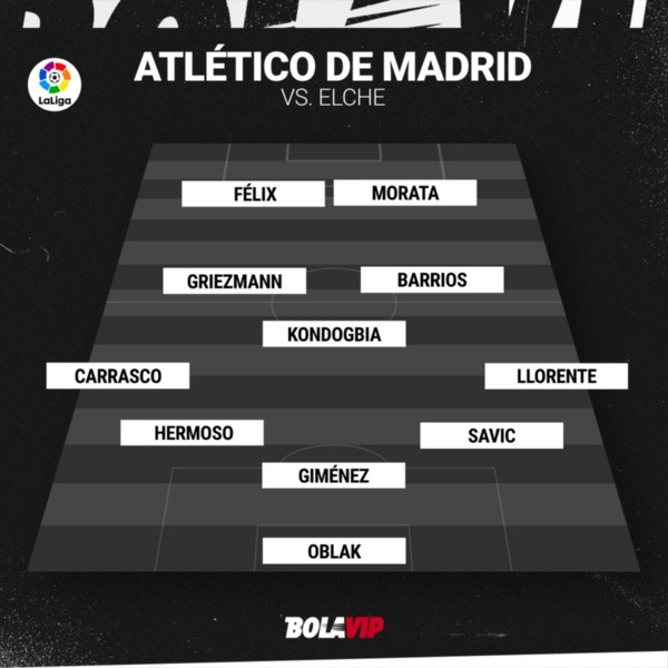 Los de Simeone saltarán al campo con: Jan Oblak; Marcos Llorente, Stefan Savic, José María Giménez, Mario Hermoso, Yannick Carrasco; Pablo Barrios, Geoffrey Kondogbia, Antoine Griezmann; João Félix y Álvaro Morata.
