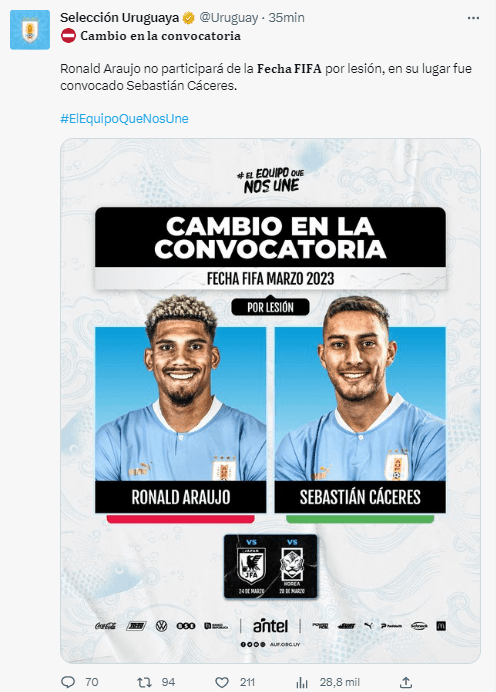 Este lunes 20 de marzo, la Selección de Uruguay anunció por medio de sus redes oficiales que Araújo se cae de la convocatoria para esta próxima fecha FIFA.Sebastián Cáceres tomará el lugar del defensor azulgrana en la lista para los amistosos.