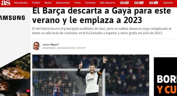 El capitán del Valencia hace suspirar a Xavi. AS comenta que en Barcelona llevan meses trabajando su llegada al equipo, pero que esta no se dará hasta el 2023 con el objetivo de esperar la finalización de su vínculo con el conjunto Ché y asegurarse así un fichaje a coste cero que no afecte las cuentas del club.