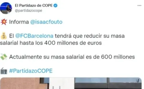 Isaac Fouto, periodista de la Cadena COPE, es quien asegura que de cara a poder incorporar en 2023 tal y como lo hizo a mediados del 2022 (gastar lo que ingrese), Barcelona tendrá que reducir una masa salarial que llega ahora mismo a los 600 millones de euros en el presupuesto anual del club. Llegar a 200 para junio, única vía para volver a la normalidad.