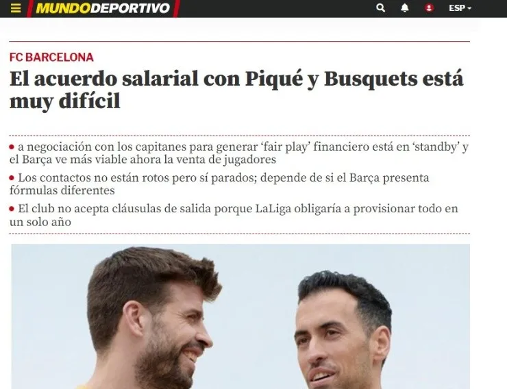 Se necesita dinero en el Camp Nou, euros y nuevos contratos para poder terminar de inscribir a todos los fichajes, pero hasta aquí no hay grandes novedades en cuanto al apartado de salidas o renovaciones low-cost. Mientras se espera por nuevos contactos con Manchester City o LaLiga para lograr su objetivo, Mundo Deportivo no duda sobre el futuro inmediato de Gerard Piqué o Sergio Busquets.