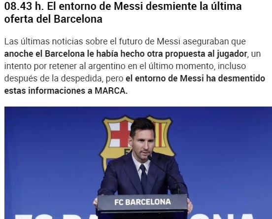 AS y Mundo Deportivo marcan que haya sido verdad o no este último intento de Barcelona por retener a Messi, el club habría buscado justamente ese no de Lionel para volver a protegerse y asegurar que se hizo todo lo que estaba en sus manos. Desde este lado del Atlántico, Pollo Vignolo y Diario Olé afirman que Messi será del PSG en unas horas o días.
