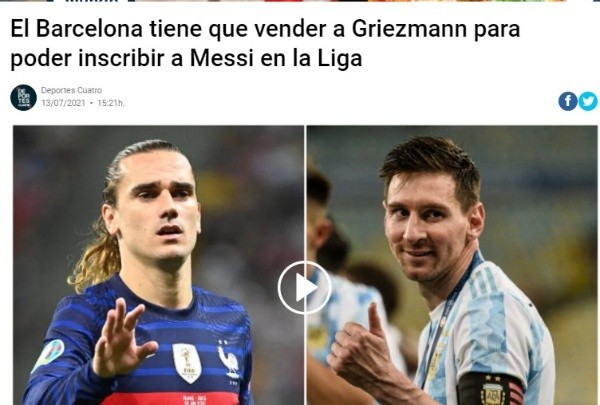 Deportes Cuatro marcaba en uno de sus informativos anoche que en Barcelona hay preocupación en cuanto a la situación de Griezmann, a quien se le sigue relacionando con un regreso al Atlético de Madrid. El francés es el principal apuntado para liberar una masa salarial donde sus 31 millones de contrato suponen una buena parte de lo que necesita Laporta para fichar a Messi. En caso de no poder venderle, en Cataluña tendrían un plan B.