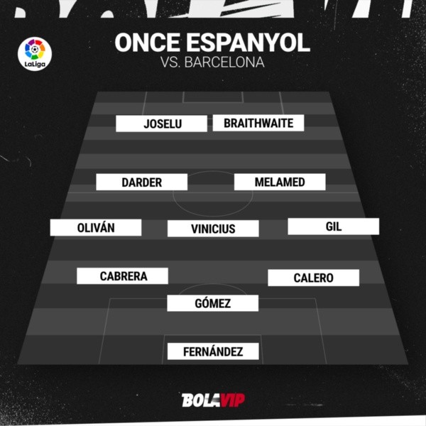 Álvaro Fernández; Óscar Gil, Fernando Calero, Sergi Gómez, Leandro Cabrera, Brian Oliván; Nicolás Melamed, Vinicius Souza;Martin Braithwaite,Sergi DarderyJoselu conformarán la alineación titular del Espanyol para el derbi catalán.